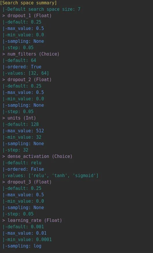 在Keras Tuner中,超参数具有类型(可能是Float,Int,Boolean和Choice)和唯一名称。然后,需要设置一组帮助指导搜索的选项: