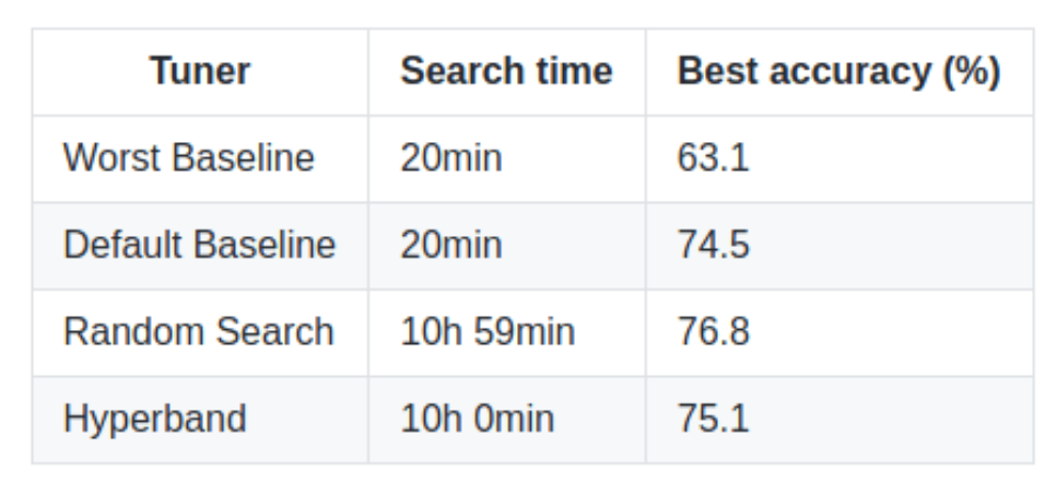 超频带是随机搜索的优化版本,它使用早期停止来加快超参数调整过程。主要思想是使大量模型适合少数时期,并且仅继续训练在验证集上获得最高准确性的模型。max_epochs变量是可以训练模型的最大时期数。