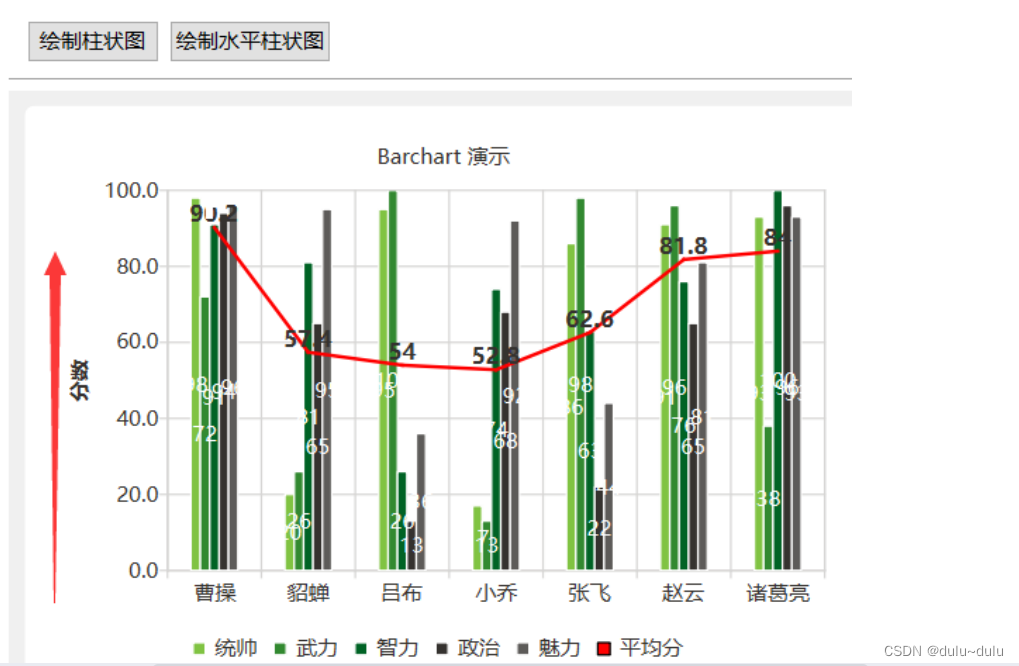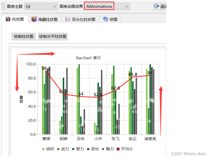 from Ui_MainWindow import Ui_MainWindowclass QmyMainWindow(QMainWindow):def __init__(self, parent=None):super().__init__(parent)#调用父类构造函数,创建窗体self.ui=Ui_MainWindow()#创建UI对象self.ui.setupUi(self)#构造UI界面self.setWindowTitle("三国志")self.ui.tableView.setAlternatingRowColors(True)self.ui.treeWidget.setAlternatingRowColors(True)self.setStyleSheet("QTreeWidget,QTableView{""alternate-background-color:rgb(170,241,190)}")self.dataModel=QStandardItemModel(self)#数据模型self.ui.tableView.setModel(self.dataModel)#设置数据模型self.__openDB()#打开数据库self.__generateData()#初始化数据self.__surveyData()#数据统计self.__iniBarChart()#柱状图初始化self.__iniStackedBar()#堆叠状图初始化self.__iniPercentBar()#百分比柱状图初始化self.__iniPieChart()#饼图初始化##=====page 1.柱状图=========@pyqtSlot()def __iniBarChart(self):chart =QChart()chart.setTitle("Barchart 演示")chart.setAnimationOptions(QChart.AnimationOption.SeriesAnimations)self.ui.chartViewBar.setChart(chart)#为ChartView设置chartself.ui.chartViewBar.setRenderHint(QPainter.RenderHint.Antialiasing)#反走样self.ui.chartViewBar.setCursor(Qt.CursorShape.CrossCursor)#设置鼠标指针为十字星##绘制柱状图,或水平柱状图def draw_barChart(self, isVertical=True):chart = self.ui.chartViewBar.chart()chart.removeAllSeries() #删除所有序列for axis in chart.axes():chart.removeAxis(axis) #删除坐标轴if isVertical:chart.setTitle("Barchart 演示")chart.legend().setAlignment(Qt.AlignmentFlag.AlignBottom)else:chart.setTitle("Horizontal Barchart 演示")chart.legend().setAlignment(Qt.AlignmentFlag.AlignRight)setTongshuai = QBarSet("统帅")setWuli = QBarSet("武力")setZhili=QBarSet("智力")setZhengzhi=QBarSet("政治")setMeili = QBarSet("魅力")seriesLine = QLineSeries()seriesLine.setName("平均分")pen=QPen(Qt.GlobalColor.red)pen.setWidth(2)seriesLine.setPen(pen)seriesLine.setPointLabelsVisible(True)if isVertical:seriesLine.setPointLabelsFormat("@yPoint")else:seriesLine.setPointLabelsFormat("@xPoint")font=seriesLine.pointLabelsFont()font.setPointSize(10)font.setBold(True)seriesLine.setPointLabelsFont(font)stud_Count=self.dataModel.rowCount()nameList=[]#学生姓名列表,用于QBarCategoryAxis类坐标轴for i in range(stud_Count): #从数据模型中获取数据item=self.dataModel.item(i, 0)#第0列姓名nameList.append(item.text())#姓名,用作坐标轴标签item=self.dataModel.item(i, 1)#第一列统帅setTongshuai.append(float(item.text()))item=self.dataModel.item(i, 2)#第二列武力setWuli.append(float(item.text()))item=self.dataModel.item(i, 3)#第三列智力setZhili.append(float(item.text()))item=self.dataModel.item(i, 4)#第四列政治setZhengzhi.append(float(item.text()))item=self.dataModel.item(i, 5)#第五列魅力setMeili.append(float(item.text()))item=self.dataModel.item(i, 6)if isVertical:seriesLine.append(i, float(item.text()))#平均分,用于柱状图else:seriesLine.append(float(item.text()), i)#平均分,用于水平柱状图#创建一个序列QBarSeries,并添加数据集if isVertical:seriesBar =QBarSeries()#柱状图else:seriesBar=QHorizontalBarSeries()#水平柱状图seriesBar.append(setTongshuai)#添加数据集seriesBar.append(setWuli)seriesBar.append(setZhili)seriesBar.append(setZhengzhi)seriesBar.append(setMeili)#数据点标签可见seriesBar.setLabelsVisible(True)#数据点标签可见seriesBar.setLabelsFormat("@value")#显示数值标签seriesBar.setLabelsPosition(QAbstractBarSeries.LabelsPosition.LabelsCenter)#数据标签显示位置seriesBar.hovered.connect(self.do_barSeries_Hovered)#hovered信号seriesBar.clicked.connect(self.do_barSeries_Clicked)#clicked信号chart.addSeries(seriesBar)#添加柱状图序列chart.addSeries(seriesLine)#添加折线图序列##学生姓名坐标轴axisStud=QBarCategoryAxis()axisStud.append(nameList)#添加横坐标文字列表axisStud.setRange(nameList[0], nameList[stud_Count-1])#坐标轴范围#数值型坐标轴axisValue=QValueAxis()axisValue.setRange(0, 100)axisValue.setTitleText("分数")axisValue.setTickCount(6) #刻度线数量axisValue.applyNiceNumbers() #让刻度线更好看if isVertical:chart.addAxis(axisStud, Qt.AlignmentFlag.AlignBottom)seriesBar.attachAxis(axisStud)seriesLine.attachAxis(axisStud)chart.addAxis(axisValue, Qt.AlignmentFlag.AlignLeft)seriesBar.attachAxis(axisValue)seriesLine.attachAxis(axisValue)else:chart.addAxis(axisStud, Qt.AlignmentFlag.AlignLeft)seriesBar.attachAxis(axisStud)seriesLine.attachAxis(axisStud)chart.addAxis(axisValue, Qt.AlignmentFlag.AlignBottom)seriesBar.attachAxis(axisValue)seriesLine.attachAxis(axisValue)for marker in chart.legend().markers():#QLegendMarker类型列表marker.clicked.connect(self.do_LegendMarkerClicked)@pyqtSlot()def on_btnBuildBarChart_clicked(self):self.draw_barChart()@pyqtSlot() ##绘制水平柱状图def on_btnBuildBarChartH_clicked(self):self.draw_barChart(False)#与seriesBar.hovered.connect(self.do_barSeries_Hovered)关联def do_barSeries_Hovered(self, status, index, barset):hint = "hovered barset="+barset.label()if status:hint=hint+",index=%d,value=%.2f"%(index, barset.at(index))else:hint=""self.ui.statusbar.showMessage(hint)def do_barSeries_Clicked(self, index, barset):hint="clicked barSet="+barset.label()hint=hint+",count=%d,sum=%.2f"%(barset.count(), barset.sum())self.ui.statusbar.showMessage(hint)@pyqtSlot()def __openDB(self):self.DB=QSqlDatabase.addDatabase("QODBC")self.DB.setHostName("localhost")self.DB.setDatabaseName("pyqt")self.DB.setUserName("pyqt")self.DB.setPassword("pyqt123456")if not self.DB.open():QMessageBox.warning(self, "错误", "打开数据库失败")@pyqtSlot()def __generateData(self):self.dataModel.clear()headerList=["姓名", "统帅", "武力", "智力", "政治", "魅力", "平均分"]self.dataModel.setHorizontalHeaderLabels(headerList)#设置头文字qryStudList = QSqlQuery(self.DB)#学生信息列表qryStudList.exec("select 姓名,统帅,武力,智力,政治,魅力 from sanguozhi