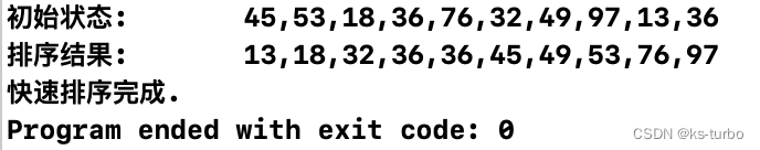 {int n = 10;SeqList R;R[1].key = 45; R[2].key = 53; R[3].key = 18; R[4].key = 36; R[5].key = 76;R[6].key = 32; R[7].key = 49; R[8].key = 97; R[9].key = 13; R[10].key = 36;printf("初始状态: "); p(R, n);QuickSort(R, 1, n);printf("排序结果: "); p(R, n);printf("快速排序完成.\n");return 0;