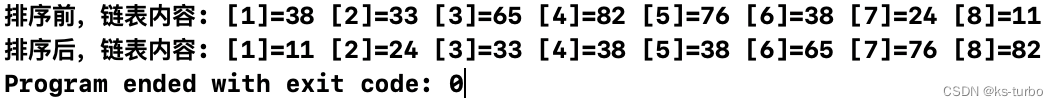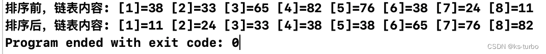 {LinkList L = CreateLinkList();LinkList L2 = CreateLinkList();InsertList(L, 1, (DataType)38);InsertList(L, 2, (DataType)33);InsertList(L, 3, (DataType)65);InsertList(L, 4, (DataType)82);InsertList(L, 5, (DataType)76);InsertList(L, 6, (DataType)38);InsertList(L, 7, (DataType)24);InsertList(L, 8, (DataType)11);printf("排序前,链表内容: "); p(L);L2 = LSelectSort2(L);printf("排序后,链表内容: "); p(L2);return 0;