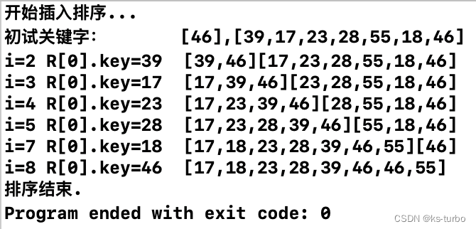 {int n = 8;SeqList R; // R为待排序的记录文件R[1].key = 46; R[2].key = 39; R[3].key = 17;R[4].key = 23; R[5].key = 28; R[6].key = 55;R[7].key = 18; R[8].key = 46;printf("开始插入排序...\n");InsertSort(R, n);printf("排序结束.\n");return 0;