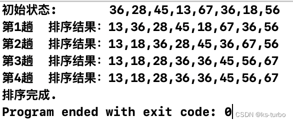 {int i, j, flag;for (i = 1; i < n; i++) // 最多做n-1趟排序{flag = 0; // flag表示每一趟是否有交换,先置0for (j = n; j >= i + 1; j--) // 进行第i趟排序{if (R[j].key < R[j - 1].key){R[0] = R[j - 1]; // R[0]作为交换时的暂存单元R[j - 1] = R[j];R[j] = R[0];flag = 1; // 有交换,flag置1}}for(int k = 1; k <= n; k++)if (k == 1)printf("第%d趟 排序结果:%d", i, R[k].key);elseprintf(",%d", R[k].key);printf("\n");if (flag == 0) return;}