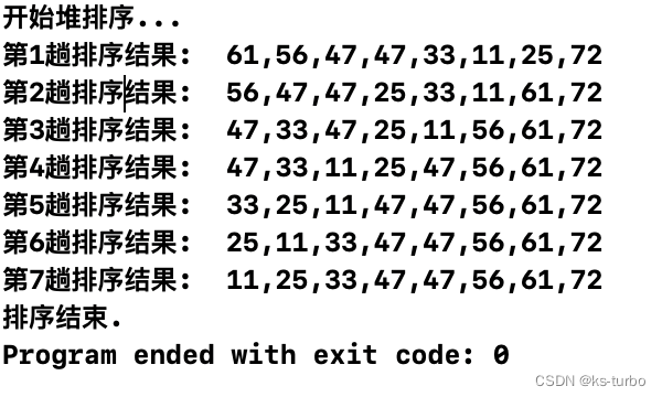 {int n = 8;SeqList R; // R为待排序的记录文件R[1].key = 47; R[2].key = 33; R[3].key = 61;R[4].key = 56; R[5].key = 72; R[6].key = 11;R[7].key = 25; R[8].key = 47;printf("开始堆排序...\n");HeapSort(R, n);printf("排序结束.\n");