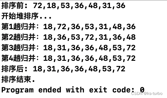 {int n = 7;SeqList R; // R为待排序的记录文件SeqList MR; //排序结果保存位置R[1].key = 72; R[2].key = 18; R[3].key = 53;R[4].key = 36; R[5].key = 48; R[6].key = 31;R[7].key = 36;printf("排序前: "); p(R, n);printf("开始堆排序...\n");MergeSort(R, MR, n);printf("排序后: "); p(MR, n);printf("排序结束.\n");