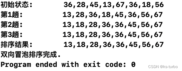 {int n = 8;SeqList R;R[1].key = 36; R[2].key = 28; R[3].key = 45; R[4].key = 13; R[5].key = 67;R[6].key = 36; R[7].key = 18; R[8].key = 56;printf("初始状态: "); p(R, n);DBubbleSort(R, n);printf("排序结果: "); p(R, n);printf("双向冒泡排序完成.\n");return 0;