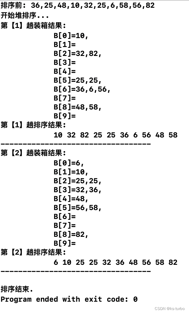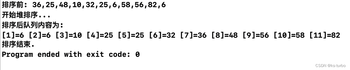 {int n = 10;SeqList R; // R为待排序的记录文件LinkList L;L = CreateLinkList();R[1].key = 36; R[2].key = 25; R[3].key = 48;R[4].key = 10; R[5].key = 32; R[6].key = 25;R[7].key = 6; R[8].key = 58; R[9].key = 56; R[10].key = 82;printf("排序前: "); ptr(R, n);printf("开始堆排序...\n");BinSort(R, L, n);printf("\n排序结束.\n");