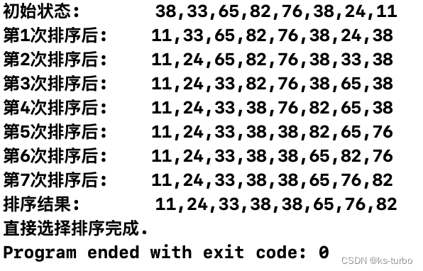 {int n = 8;SeqList R;R[1].key = 38; R[2].key = 33; R[3].key = 65; R[4].key = 82; R[5].key = 76;R[6].key = 38; R[7].key = 24; R[8].key = 11;printf("初始状态: "); p(R, n);SelectSort(R, n);printf("排序结果: "); p(R, n);printf("直接选择排序完成.\n");return 0;