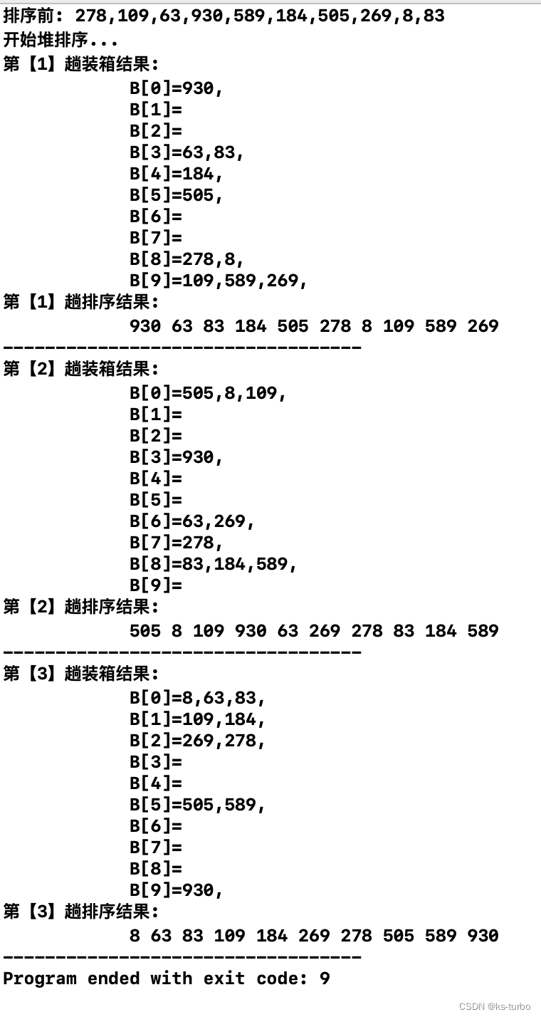 {int i, j, round = 1, maxRound = 1;KeyType k;ListNode *p;bool sign = false; // 标记位,用来记录基数位是否有变化LinkList B[DECMIAL_BASE]; // 链表数组,大小为十进制基数,即0~9for (i = 0; i < DECMIAL_BASE; i++) // 初始化10个链表B[i] = CreateLinkList();while (round <= maxRound) // 使用基数拆分排序,直到最高位已经排序过{for (i = 1; i <= n; i++) // 逐个装入箱子{if (!sign &&(R[i].key / (int)(pow(10, round))) % 10 > 0) // 如果最大基数位未变化或者最大基数位不能整除{ // 说明最大基数位无需变化maxRound++; // 最大基数位+1sign = true; // 最大基数位发生了变化}k = (R[i].key / (int)(pow(10, round - 1))) % 10; // 个位、十位、百位...以此类推p = (ListNode*)malloc(sizeof(ListNode)); // 创建存储空间p->data = R[i].key;AddNode(B[k], p); // 装入箱子}printf("第【%d】趟装箱结果:\n", round);j = 1;for (i = 0; i < DECMIAL_BASE; i++) // 将箱子从最低序号开始提取出来并重新排队{p = B[i]->next;printf("\t\t\tB[%d]=", i);while (p != B[i]){printf("%d,", p->data);R[j++].key = p->data;p = p->next;}printf("\n");}printf("第【%d】趟排序结果:\n", round); // 显示排队后的结果printf("\t\t\t");for(i = 1; i <= n; i++){printf("%d ", R[i].key);}printf("\n");printf("----------------------------------\n");for (i = 0; i < DECMIAL_BASE; i++) // 将箱子清空,未下一个基数位装箱做准备ClearAllNode(B[i]);round++; // 趟数+1,即进入百分位、千分位等等sign = false; // 设置最高基数位可变化}