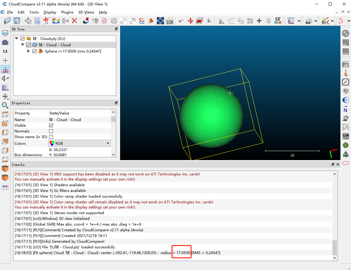 2、找到CloudCompare软件中的拟合球体选项,计算球体的直径,然后与实际的尺寸做比对,下图为得到的拟合的球体