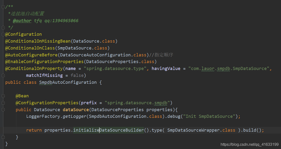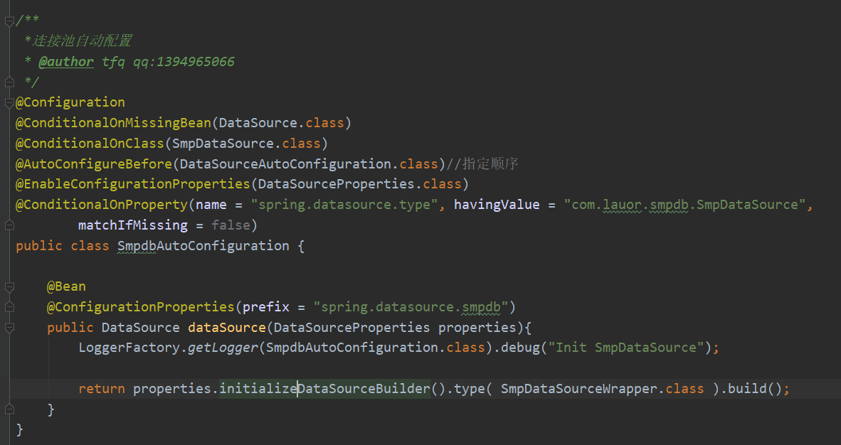 这里需要说明的是springboot默认会尝试使用com.zaxxer.hikari.HikariDataSource,org.apache.tomcat.jdbc.pool.DataSource,org.apache.commons.dbcp2.BasicDataSource作为连接池,相关代码逻辑在org.springframework.boot.autoconfigure.jdbc.DataSourceConfiguration,因此配置spring-boot-starter的时候先要确保应用没有配置连接池。