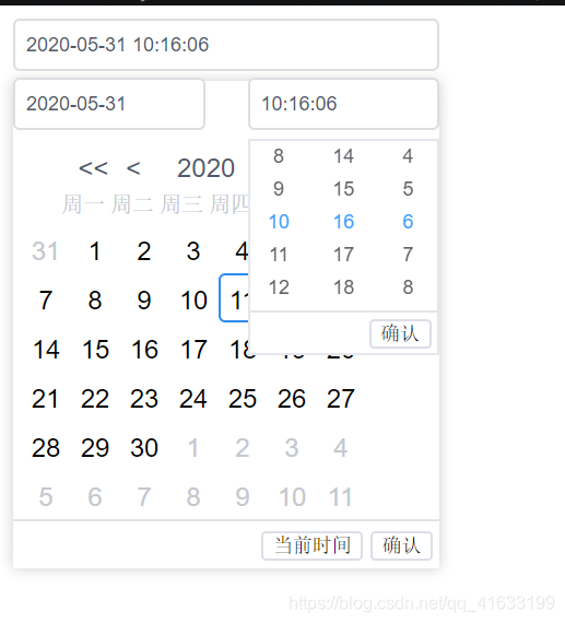Vue.component("iic-datetime", {props: {value: {type: [Date, String],default: ""},dateFormat: {//时间到天的格式type: String,default: "yyyy-MM-dd"},timeFormat: {//时间从小时到秒的格式type: String,default: "hh:mm:ss"}},mounted: function() {var dateNode = this.$refs.dateTimeRef;var timeNode = this.$refs.timeRef;var inputTimeNode = this.$refs.inputTimeRef;var that = this;window.addEventListener("click", function(e){if (dateNode.contains(e.target)) {if (!timeNode.contains(e.target) && !inputTimeNode.contains(e.target)) {that.timePanelStatus = false;}} else {that.panelState = false;}});if (this.value) {this.initDate( new Date(this.value) );}},destroyed: function() {window.removeEventListener("click", this.eventListener);},data: function() {return {fullTimeValue: "",//显示日期加精确到秒的时间dateValue: "", // 输入框显示日期timeValue: "",//时间选项timePanelStatus: true,//时间选择面板是否展示date: new Date().getDate(), // 当前日期panelState: false, // 初始值,默认panel关闭tmpMonth: new Date().getMonth(), // 临时月份,可修改month: new Date().getMonth(),tmpYear: new Date().getFullYear(), // 临时年份,可修改weekList: [{ label: "周一", value: 0 },{ label: "周二", value: 1 },{ label: "周三", value: 2 },{ label: "周四", value: 3 },{ label: "周五", value: 4 },{ label: "周六", value: 5 },{ label: "周天", value: 6 }], // 周monthList: [{ label: "一月", value: 0 },{ label: "二月", value: 1 },{ label: "三月", value: 2 },{ label: "四月", value: 3 },{ label: "五月", value: 4 },{ label: "六月", value: 5 },{ label: "七月", value: 6 },{ label: "八月", value: 7 },{ label: "九月", value: 8 },{ label: "十月", value: 9 },{ label: "十一月", value: 10 },{ label: "十二月", value: 11 }], // 月hourList: [0,1,2,3,4,5,6,7,8,9,10,11,12,13,14,15,16,17,18,19,20,21,22,23],//小时nowValue: 0, // 当前选中日期值choseHour: 0,//选中的小时choseMine: 1,choseSec: 1,panelType: "date" // 面板状态}},watch: {choseHour: function(){this.freshDate();},choseMine: function(){this.freshDate();},choseSec: function(){this.freshDate();}},computed: {minuList: function(){var minuList = [];for (var i = 1; i <= 59; i++){minuList.push(i);}return minuList;},secList: function(){var secList = [];for (var i = 1; i <= 59; i++){secList.push(i);}return secList;},dateList: function(){//获取当月的天数var currentMonthLength = new Date(this.tmpYear, this.tmpMonth + 1, 0).getDate();//先将当月的日期塞入dateListvar dateList = Array.from({ length: currentMonthLength },function (val, index) {return {currentMonth: true,value: index + 1};});// 获取当月1号的星期是为了确定在1号前需要插多少天var startDay = new Date(this.tmpYear, this.tmpMonth, 1).getDay();// 确认上个月一共多少天var previousMongthLength = new Date(this.tmpYear, this.tmpMonth, 0).getDate();// 在1号前插入上个月日期for (var i = 0, len = startDay; i < len; i++) {dateList = [{ previousMonth: true, value: previousMongthLength - i }].concat(dateList);}// 补全剩余位置,至少14天,则 i < 15for (var j = 1, item = 1; j < 15; j++, item++) {dateList[dateList.length] = { nextMonth: true, value: j };}return dateList;},changeTmpMonth: function() {return this.monthList[this.tmpMonth].label;},// 通过改变this.tmpYear则可以改变年份数组yearList: function() {return Array.from({ length: 12 }, function(value, index){return this.tmpYear + index;});}},methods: {initDate: function(initDate){this.choseHour = initDate.getHours();this.choseMine = initDate.getMinutes();this.choseSec = initDate.getSeconds();this.fullTimeValue = this.formatDate(initDate.getTime());var dateTimeArr = this.fullTimeValue.split(" ");this.dateValue = dateTimeArr[0];this.timeValue = dateTimeArr[1];},setDateWithNow: function(){this.initDate( new Date() );},togglePanel: function(){this.panelState = !this.panelState;},hourScroll: function(evt){var scrollTop = evt.target.scrollTop;this.choseHour = window.parseInt(scrollTop / 20);},minuScroll: function(evt){var scrollTop = evt.target.scrollTop;this.choseMine = window.parseInt(scrollTop / 20) + 1;},secScroll: function(evt){var scrollTop = evt.target.scrollTop;this.choseSec = window.parseInt(scrollTop / 20) + 1;},openPanel: function(){this.panelState = !this.panelState;this.panelType = "date";},openTime: function(){this.timePanelStatus = true;},selectYear: function(item){this.tmpYear = item;this.panelType = "month";},selectMonth: function(item){this.tmpMonth = item.value;this.panelType = "date";},freshDate: function(item){if (item) {// 赋值 当前 nowValue,用于控制样式突出显示当前月份日期this.nowValue = item.value;// 选择了上个月if (item.previousMonth) this.tmpMonth--;// 选择了下个月if (item.nextMonth) this.tmpMonth++;}//计算出选中时间对象var selectDay = new Date(this.tmpYear, this.tmpMonth, this.nowValue, this.choseHour, this.choseMine, this.choseSec);// 格式日期为字符串后,赋值给 inputthis.fullTimeValue = this.formatDate(selectDay.getTime());var dateTimeArr = this.fullTimeValue.split(" ");this.dateValue = dateTimeArr[0];this.timeValue = dateTimeArr[1];this.$emit("input", selectDay);},// 日期格式方法formatDate: function(date) {fmt = this.dateFormat + " " + this.timeFormat;if (date === null || date === "null") {return "--";}date = new Date(Number(date));var o = {"M+": date.getMonth() + 1, // 月份"d+": date.getDate(), // 日"h+": date.getHours(), // 小时"m+": date.getMinutes(), // 分"s+": date.getSeconds(), // 秒"q+": Math.floor((date.getMonth() + 3) / 3), // 季度S: date.getMilliseconds() // 毫秒};if (/(y+)/.test(fmt))fmt = fmt.replace(RegExp.$1,(date.getFullYear() + "").substr(4 - RegExp.$1.length));for (var k in o) {if (new RegExp("(" + k + ")").test(fmt))fmt = fmt.replace(RegExp.$1,RegExp.$1.length === 1? o[k]: ("00" + o[k]).substr(("" + o[k]).length));}return fmt;},validateDate: function(item) {if (this.nowValue === item.value && item.currentMonth) 