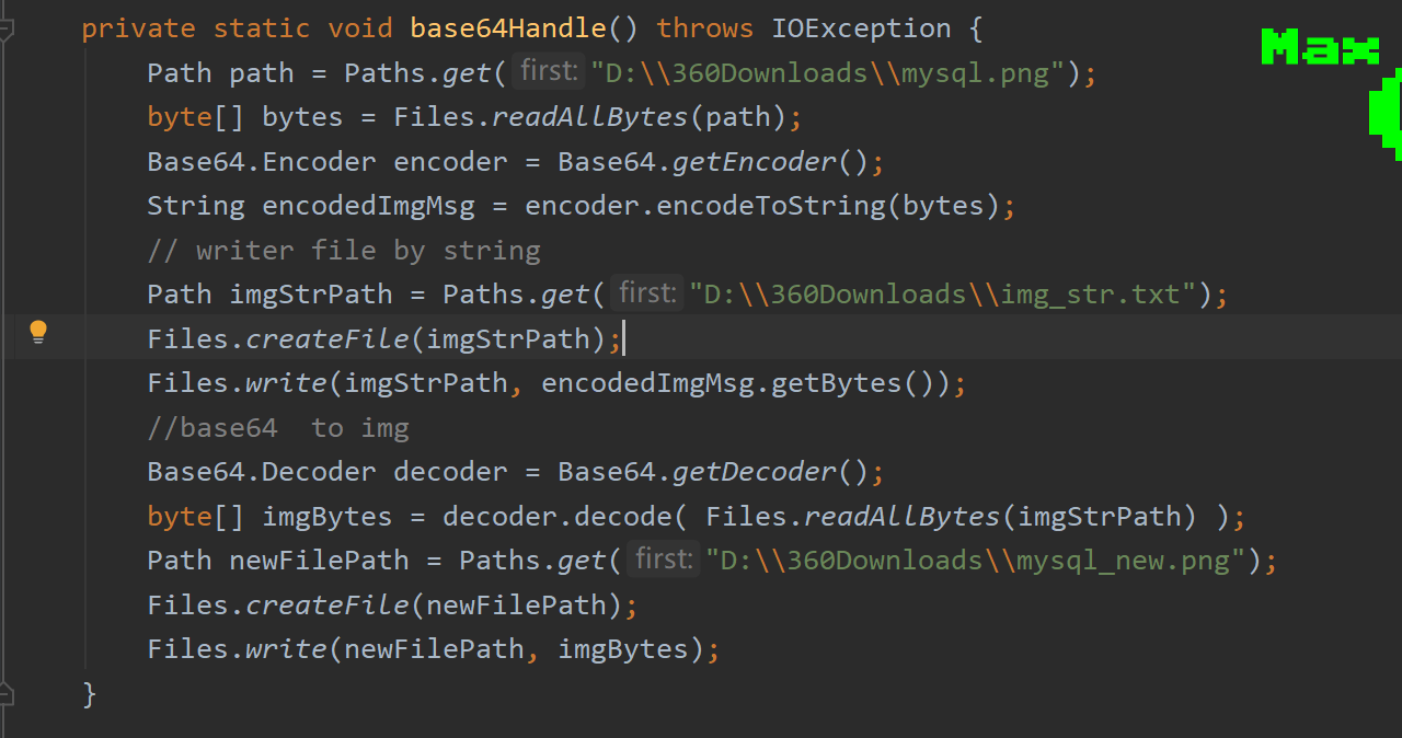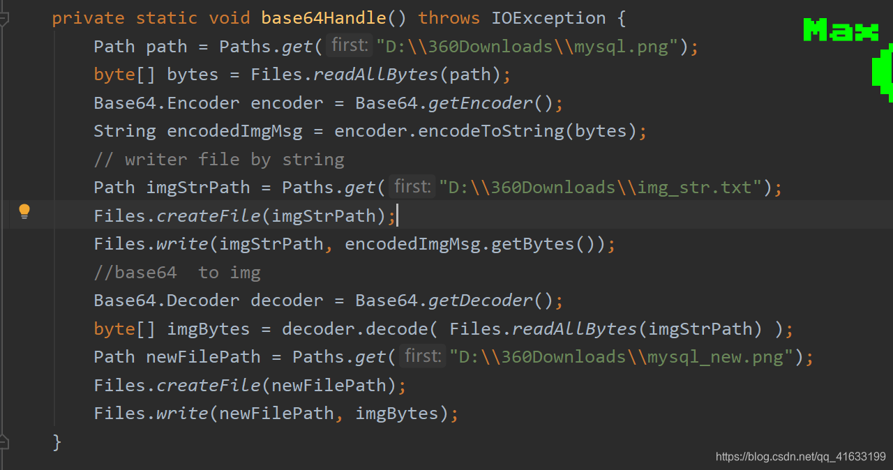 编码说白了就是按照一定规则对数据进行转换,工作原理有点类似于查字典,base64编码(叫base64的原因是因为其使用64个字符来对任意数据进行编码)可以用来将图片或者其他文件的二进制数据转换成字符串形式,以下代码是将一个图片通过base64编码成字符串,将字符串写入txt文件后再读取出来生成一个新的图片:
