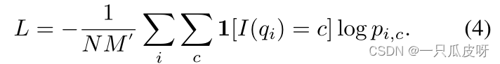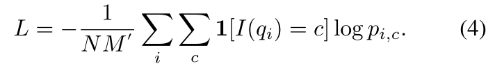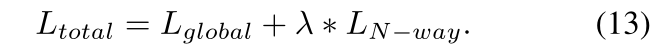 我们构建了一个 N-way 分类损失 𝐿𝑁−𝑤𝑎𝑦,如等式(4),同时构建一个全局分类损失 𝐿𝑔𝑙𝑜𝑏𝑎𝑙,附加到全连接层以将特征 𝑔𝑞𝑖∗ 分类到 Dbase 中的所有类别。那么整体损失函数定义为: