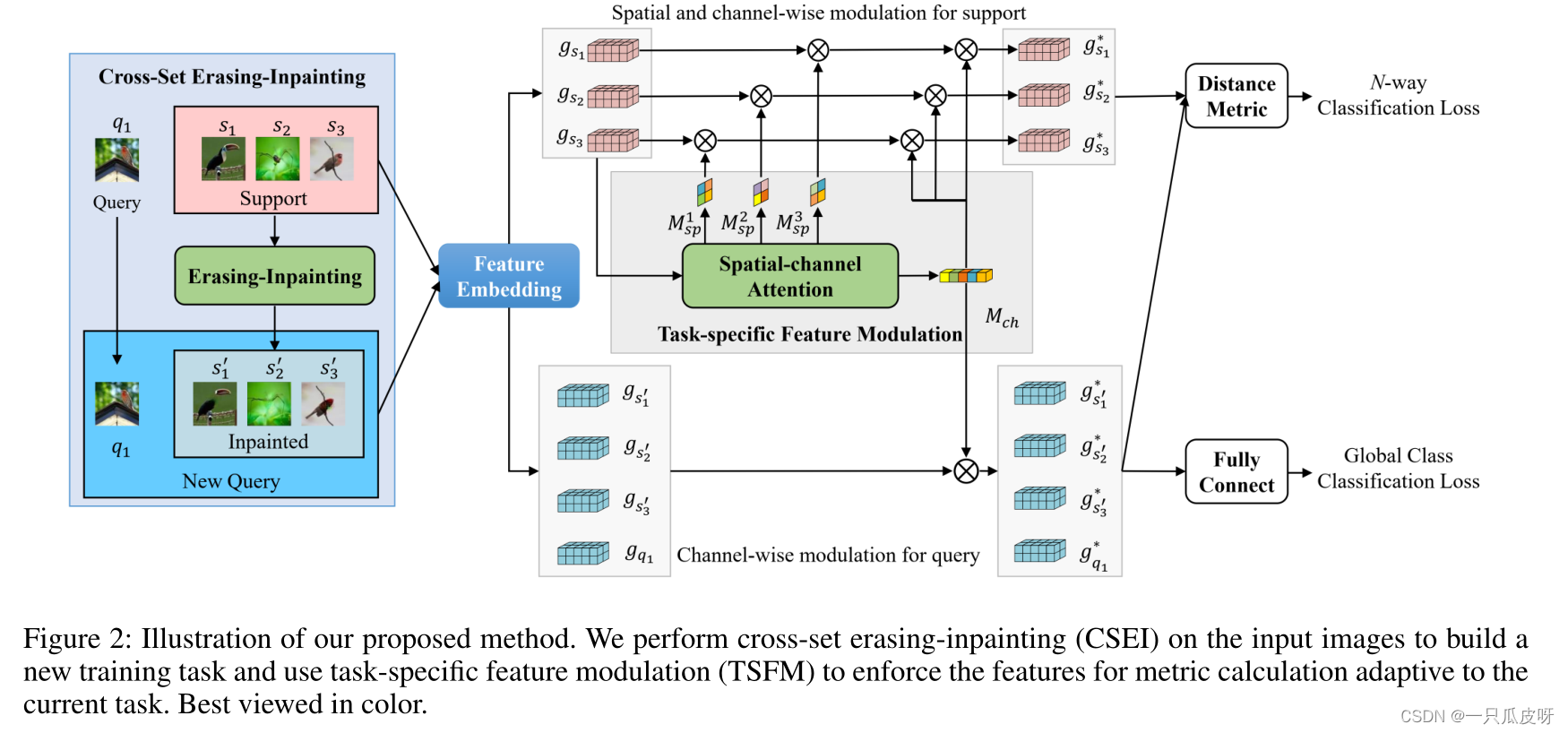 可以看出,我们使用支持集中的样本来扩充查询集,因此称为交叉集数据扩充。通过这样的数据处理,强制特征提取器响应除判别部分之外的目标对象的更多区域。具体来说,查询集中的修复样本已经删除了判别部分(例如,“头部”),相应的特征将不包含该部分的信息。在训练期间,为了将查询样本与支持样本正确匹配,特征提取器必须捕获判别部分之外的信息。