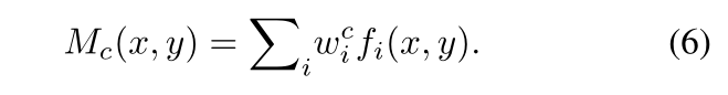 我们首先需要在基础集 Dbase 上训练一个包含全局池化层的传统分类网络。对于每个输入图像 I,令 fi(x,y) 表示在位置 (x,y) 处全局池化层之前第 i 个特征图的激活。那么类别 c 的得分为: