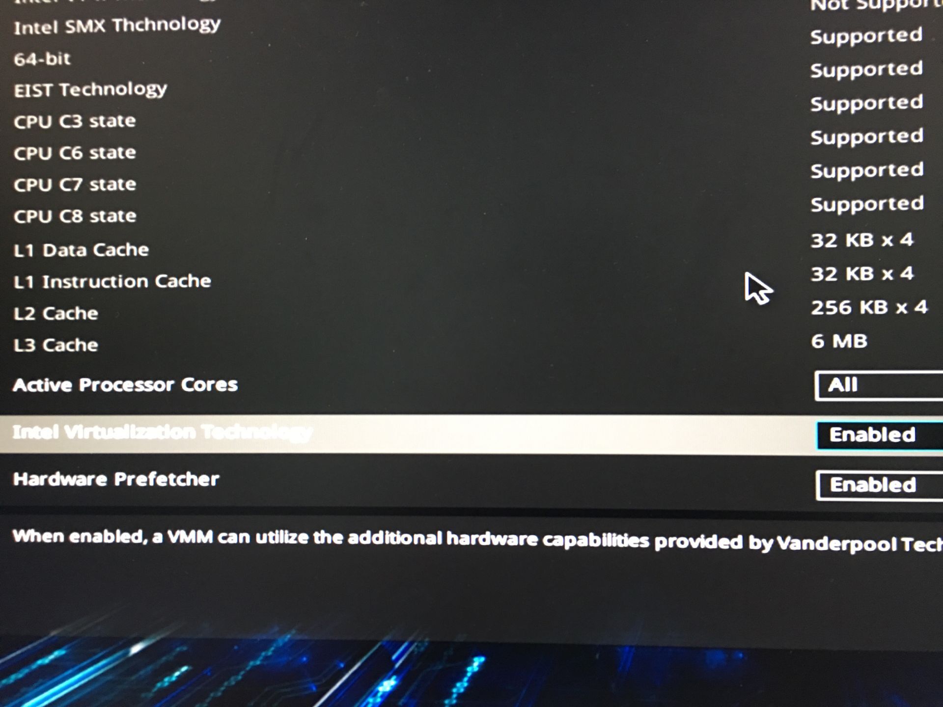 切换上下键,找到Intel Virtualization Technology选项,通过enter键调起设置菜单项,设置开启状态。
