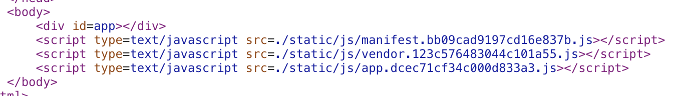 从上段代码我们就可以看出服务器端渲染的基本原理了,其实说白了,无服务器端渲染时,前端打包后的html只是包含head部分,body部分都是通过动态插入到id为#app的dom中。如图: