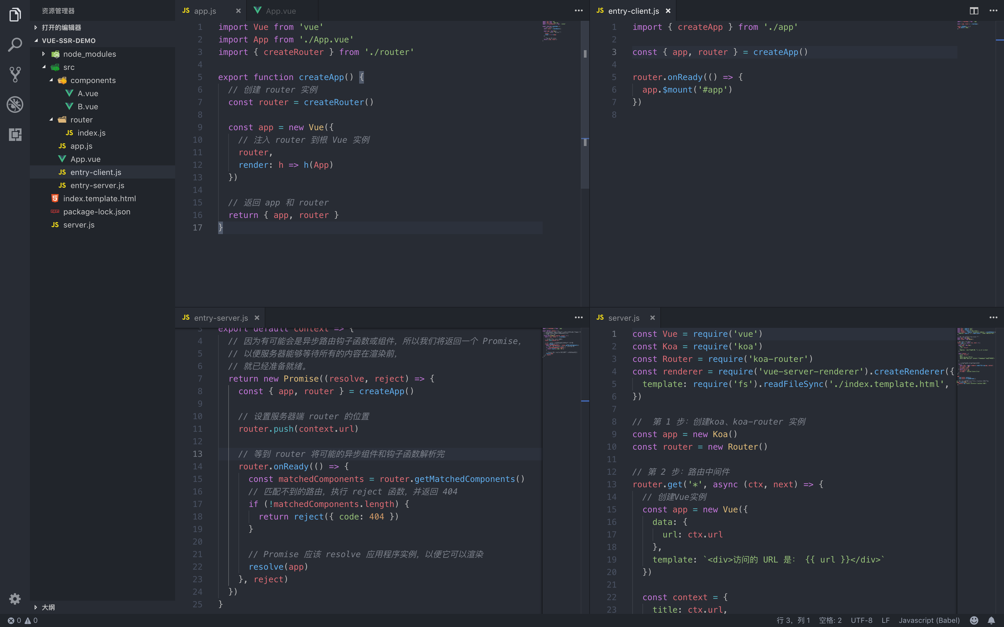 我们可以大致的理解为服务器端、客户端通过俩个入口Server entry、 Clinet entry 获取源代码,再通过webpack打包变成俩个bundlevue-ssr-server-bundle.json、vue-ssr-client-manifest.json,配合生成完成HTML,而app.js是俩个入口通用的代码部分,其作用是暴露出vue实例。所以我们可以按照官方建议整理文件目录,并按照官方事例代码编写,其中起服务的server.js我们用的是Koa,所以可以先不用改。