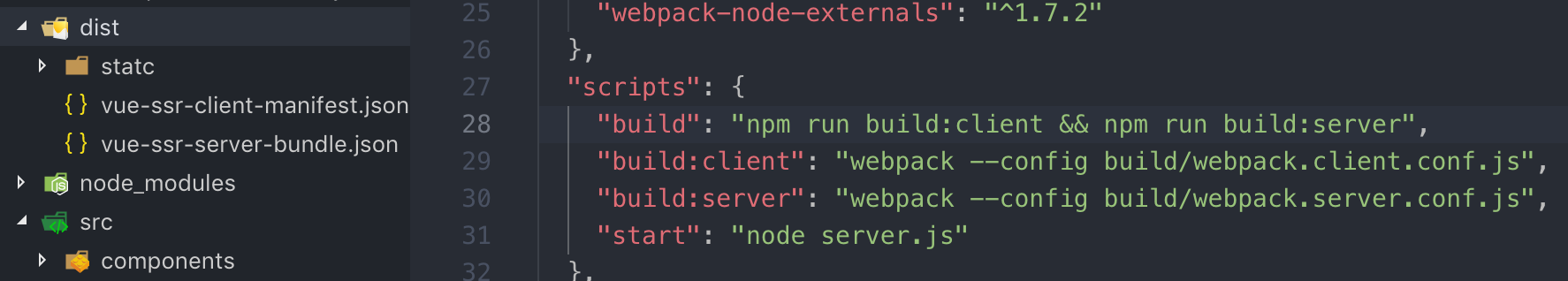 "scripts": {"build:client": "webpack --config build/webpack.client.conf.js", # 打包客户端代码"build:server": "webpack --config build/webpack.server.conf.js", # 打包服务端代码"start": "node server.js" # 启动服务