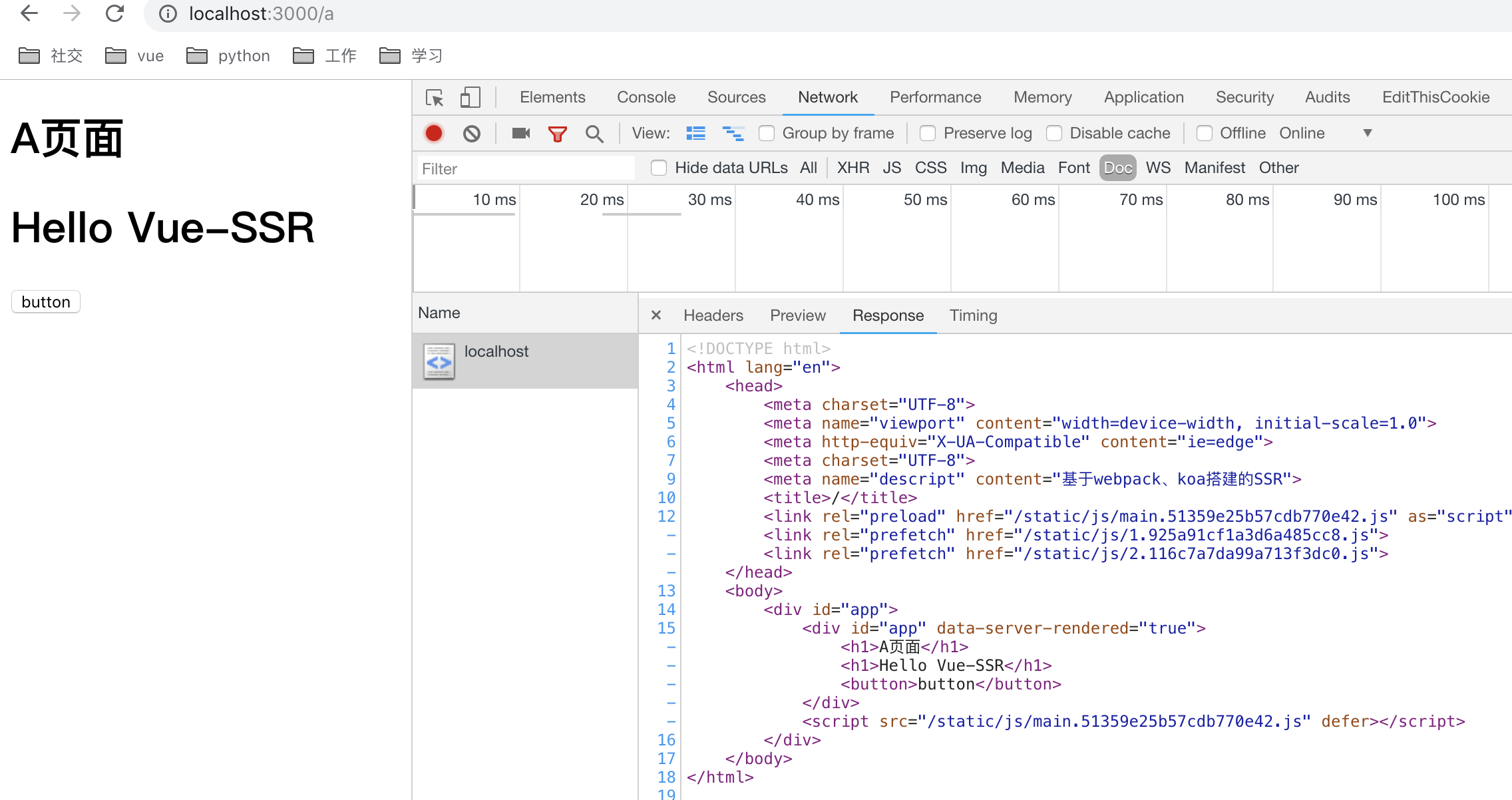 从这段代码我们应该可以明白vue-server-renderer的作用是拿到vue实例并渲染成html结构,但它不仅仅只做着一件事,后面会介绍其他配置参数和配合webpack进行构建。