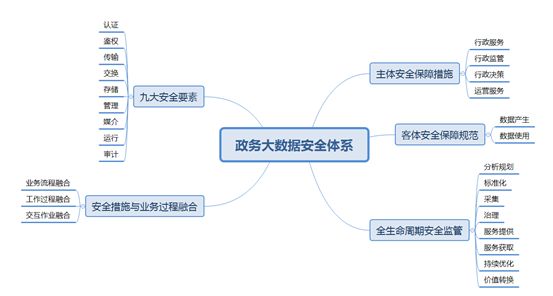 在《政务大数据的全景图》一文中讨论到:“政务大数据的主客体,在类型上可以分为管理者、运营者、提供者、所有者和使用者。其中,管理者、运营者和提供者是广义的服务提供者,是主体;所有者和使用者是广义的服务使用者(被服务对象),是客体。主体和客体都是政务大数据服务的参与者,它们之间是服务与被服务的关系。”就政务大数据的安全体系而言,区分清楚安全的主体责任和客体责任非常重要。政务大数据的管理者、运营者和提供者应承担其主体安全责任,并为其整体安全负责。政务大数据的所有者和使用者应履行客体安全义务,严格按照相关法律法规、安全管理规范、安全作业流程来进行数据使用、操作,与政务大数据的安全主体紧密配合,共同建立健全政务大数据的安全防护、保障体系。就政务大数据的生命周期而言,从数据的产生成为热数据(在线数据/活跃数据,用于OLTP&OLAP等),到数据价值逐渐转化成为冷数据(离线数据,用于数据仓库、数据挖掘、机器学习、数据分析等)整个过程的安全要求和重点有差异,需要根据数据不同的生命周期阶段采取相应的安全策略与措施。政务大数据的安全要素从认证、授权、鉴权以及数据的使用与管控等多个方面和维度,来构建其纵横交错、互成体系的安全防护网。此外,安全措施与业务过程的深度融合也是政务大数据安全体系的重要组成部分,重点是在业务流程、工作过程和作业规范三个方面。主客体防护、全周期监管、九大安全要素和安全融合共同构成了多维的政务大数据安全体系。