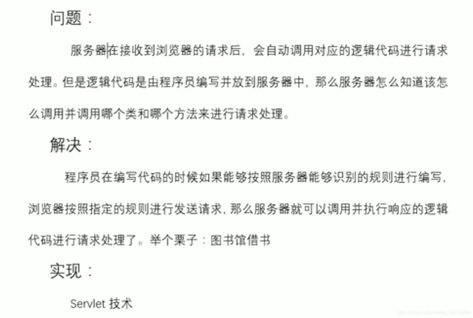 只要将程序员写的这个对象传入服务器,就可以直接执行这个代码。而这个技术就叫Servlet,只要程序员都请求都去实现servlet接口,请求的时候传给服务器容器,就去找这个实例对象中的一个service方法,去执行。而tomcat服务器就是一种这样的服务器实现。