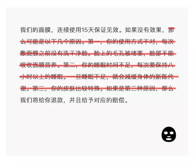 指出一个行业的负面现象,防止消费者上当受骗。向消费者表明身份,我们是有担当的人,不是那类推卸责任的人。比如面膜,微商的产品永远是100%效果的。