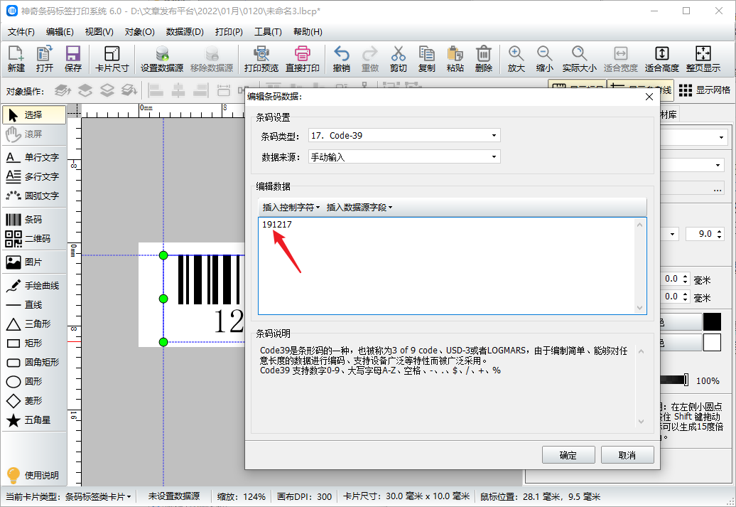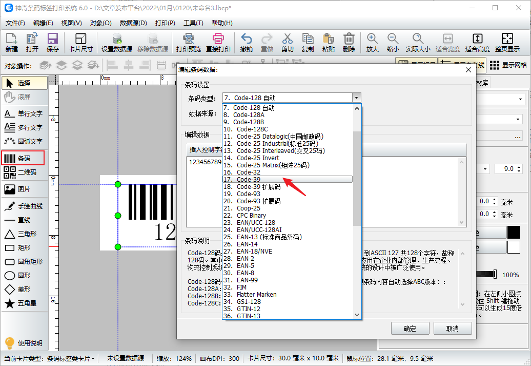 首先打开条码标签软件,新建一个标签,根据自己的需要设置标签的尺寸,点击软件左侧的条码按钮,在标签上绘制一个条形码,在弹出的界面选择条码的类型为Code39。