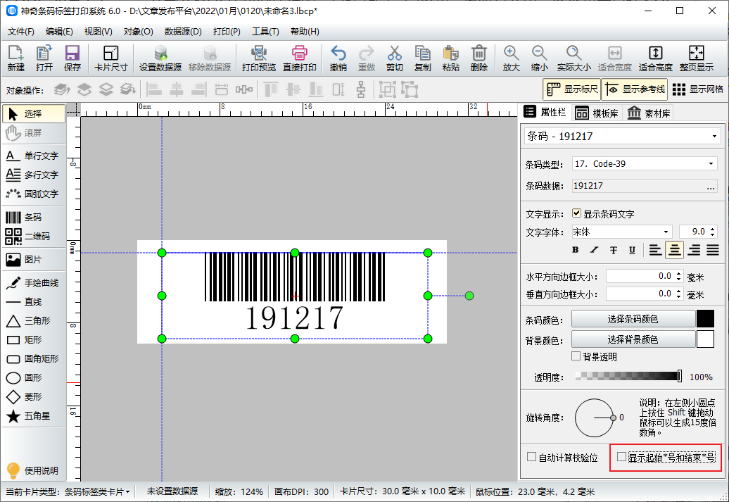 条码制作完成后,可以看到条码的前后都有一个星号。在软件右侧取消“显示起始*号和结束*号”的勾选。