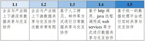 横向集成主要实现企业与企业之间、企业与售出产品(客户)之间的协同,将企业内部的业务信息向企业以外的供应商、经销商、用户进行延伸,实现企业与产业链上下游之间的集成。能力等级如下: