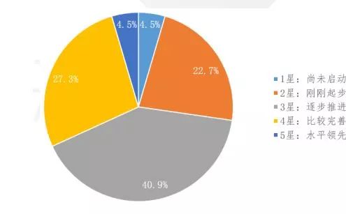 基于本成熟度评估模型,22 份有效样本中,1 星企业 1家,2 星企业 5 家,3 星企业 9 家,4 星企业 6 家,5 星企业1 家,其中有 4 家企业因单项能力弱被降级(如图表 24 所示)。