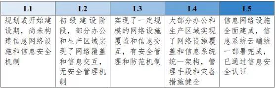 信息网络设施是指企业通过全面的 IT 网络和 OT 网络(涉及现场总线、工业以太网、无线网等)建设、灵活的信息系统架构以及完善的信息安全机制建立等为制造企业构建良好的网络互通和信息互联基础设施。能力等级如下: