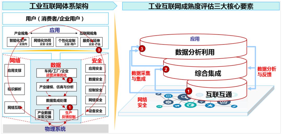 遵循《工业互联网体系架构(版本 1.0)》的主体思路。工业互联网的核心是基于全面互联而形成数据驱动的智能,基于工业互联网的网络、数据与安全,将构建面向工业智能化发展的三大优化闭环,即面向机器设备运行优化的闭环、面向生产运营优化的闭环、面向企业协同、用户交互与产品服务优化的闭环。三大闭环并不是简单割裂的关系,而是环环相扣、互相贯穿,机器设备的互联互通、生产运营系统的综合集成,为企业协同、用户交互所需的数据流动和协作奠定了良好的基础。