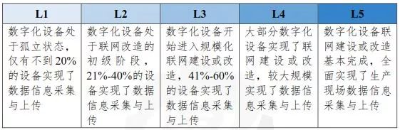 智能设备联网是指生产现场的生产设备、产线和工艺装置、工业机器人、传感设备等数字化物理实体通过标准通信接口、协议转换等方式将数据上传至车间层、企业层管理系统或监控系统。能力等级如下: