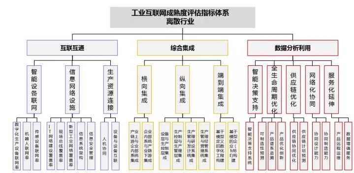 本评估模型主要面向离散型和流程型制造企业,在构建评估体系时着重考虑了两者不同的行业特性。在互联互通环节,离散行业生产现场设备中机床、机器人、传感器等占主导,而流程行业中以工艺设备、阀门、仪器仪表设备等占主导。在综合集成环节,离散和流程行业除具备现场层、车间层、企业层纵向集成等共同特性外,离散行业对产品设计研发系统建设与集成有较高的要求,而流程行业侧重于工艺设计、能源安全管理等方面。在数据分析利用环节,离散行业基于大数据进行新业务和新模式创新主要体现在产品远程运维、个性化定制、网络化协同等方面,流程行业则主要体现在供应链优化、能耗与安全管理优化等方面。