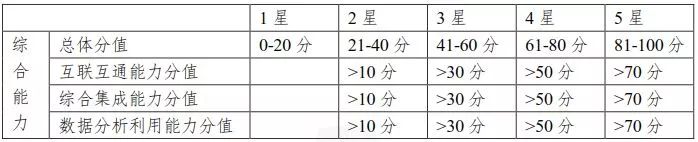 总体能力评估分值和星级对应时不仅要求总体分值达标,也对单项能力分值设置了门槛,避免了单项能力过于薄弱而总分达标的企业获取较高星级的情况,如果总体分值达标,但某一单项能力分值未达标,则做降级处理,如 A 企业总体分值达到了 3 星,但其中一个单项能力低于 35 分,则只能评定 2 星。对应原则如下: