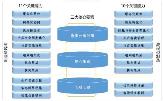 通过对三大核心要素现阶段发展所需具备的关键能力进行深入研究,本着化繁为简、去粗取精、求同存异的原则,本模型提取了 13 个关键能力,其中面向离散行业的有 11 个,面向流程行业的有 10 个(如图表 2 所示)。