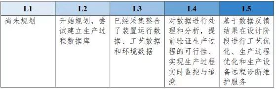 生产智能管理是指在产品工艺设计、原料生产转化、生产装置运行的过程中,企业通过各环节数据的采集、分析、建模、仿真、反馈等预测加工工艺的可行性、实时监控与追溯生产过程、实现异常工况提前诊断与自愈控制。能力等级如下: