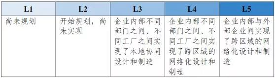 网络化协同是指基于网络协同平台,将订单信息、设计任务、制造任务等分配给不同地域、不同规模的企业,将社会分散的资源、制造能力在网络平台进行集聚共享,形成网络化协同的组织模式。能力等级如下: