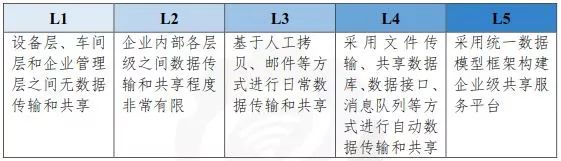 纵向集成主要解决企业内部的集成,即解决信息孤岛的问题,实现现场层、车间层、企业层等所有层次,研发、生产、销售等所有环节的信息无缝链接,包括一个环节上的集成(如研发设计内部信息集成),也包括跨环节集成(如研发和制造环节的集成)。能力等级如下: