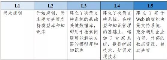 运营智能决策是指通过企业数据库、模型库和知识库的建立,将行业领域专家水平的知识与经验积累固化到计算机系统中,进而充分应用人类专家的知识和解决问题的方法来帮助企业解决在运营管理中遇到的复杂的决策问题。能力等级如下:
