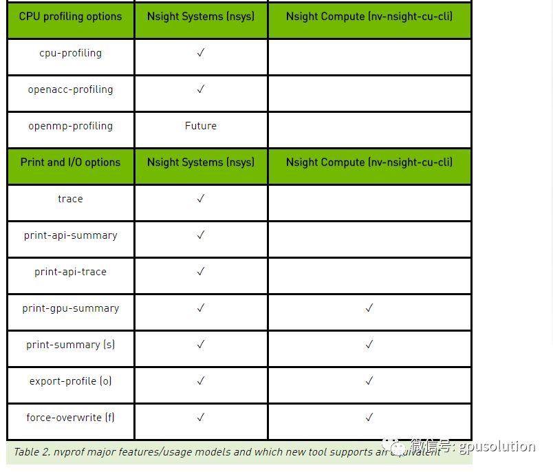 对于nvprof的用户(你可以理解成nvvp的命令行版本),同样有个命令行的nv-nsight-cu-cli可以对应,表2中列出了以前nvprof能做的,和现在改成了用哪个工具能做, 注意一些具体的命令和命令选项可能发生了一些变化。