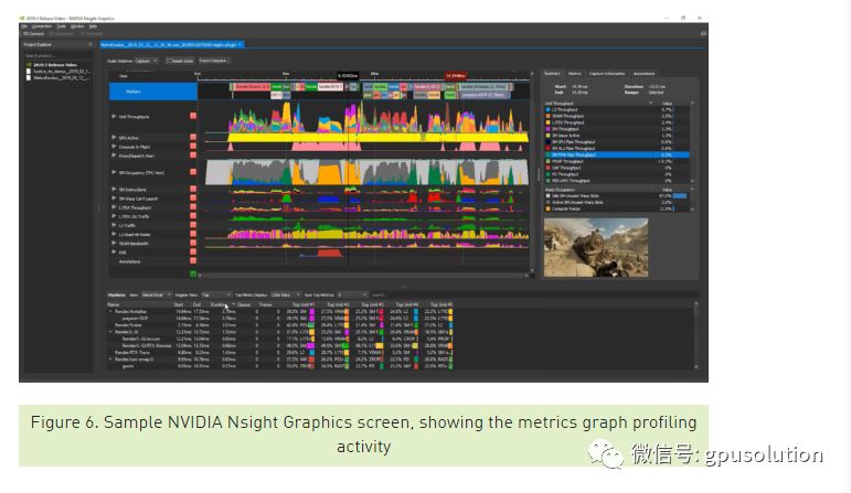 NVIDIA Nsight Graphics是一个独立的开发工具,允许您调试、配置和导出使用Direct3D (11,12, DXR)、Vulkan (1.1, NV Vulkan Ray Tracing Extension)、OpenGL、OpenVR和Oculus SDK构建的框架。当NVIDIA Nsight系统显示您有一个受GPU绑定的帧或呈现程序时,请使用此功能,如图6所示。