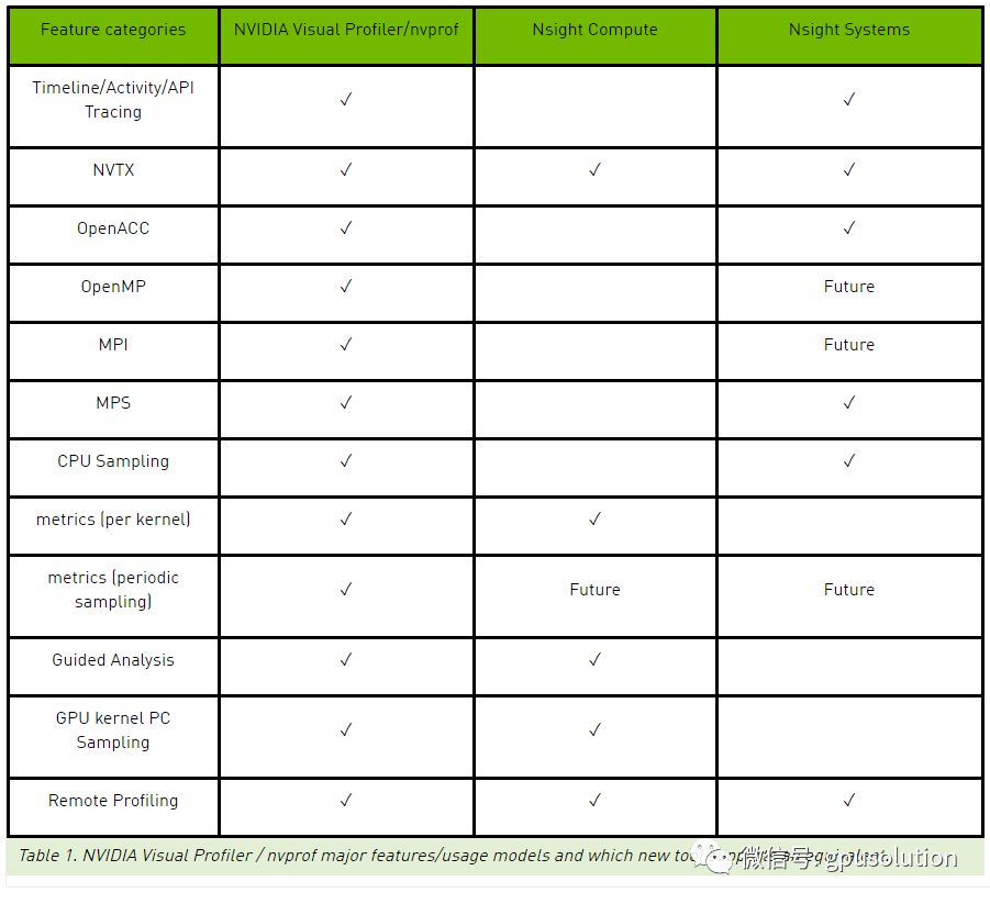 表1将NVIDIA Visual Profiler和nvprof的关键特性映射到NVIDIA Nsight工具。