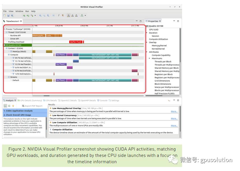 NVIDIA Nsight Systems是一个低开销的系统分析工具,如图3所示。使用它来确保您知道真正的瓶颈在哪里。在深入研究CUDA内核代码之前,应该排除其他更基本的性能限制因素,比如不必要的GPU-CPU同步、CPU绑定情况,或者仅仅使用一个糟糕的CPU端作业调度算法——这正是Nsight系统可以帮助您做的。在对系统进行重大重构或硬件更改之后,将其作为初始分析器使用。如果CPU不能很好地让GPU保持忙碌状态,你将无法从一个新的更快的GPU中获得全部好处。
