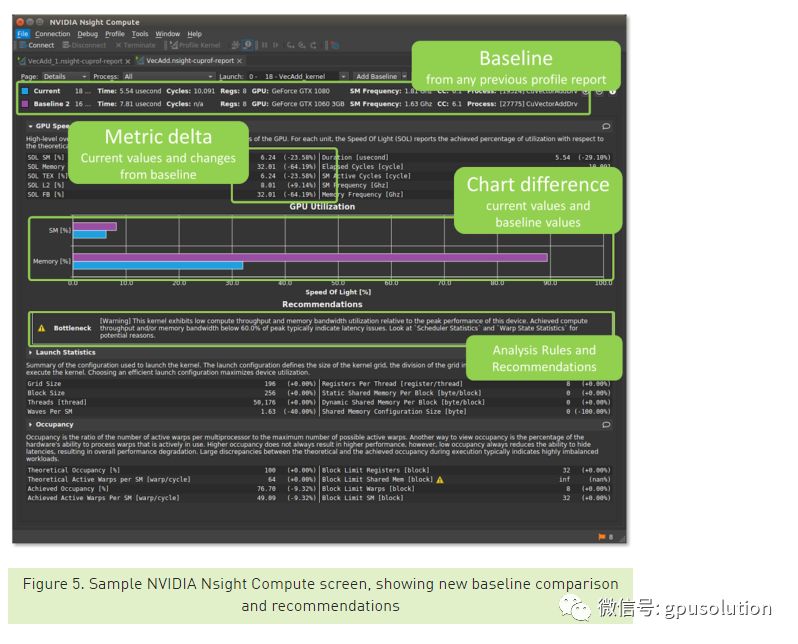 如图5所示,NVIDIA Nsight Compute是一个低级的CUDA内核分析工具。当NVIDIA Nsight系统显示性能不佳的内核时使用它,这些内核在代码重构中明显变得更糟,或者已经成为性能瓶颈。此外,在内核开发期间使用它,可以获得关于代码更改如何影响内核性能的即时反馈,以及如何与以前的迭代进行比较。