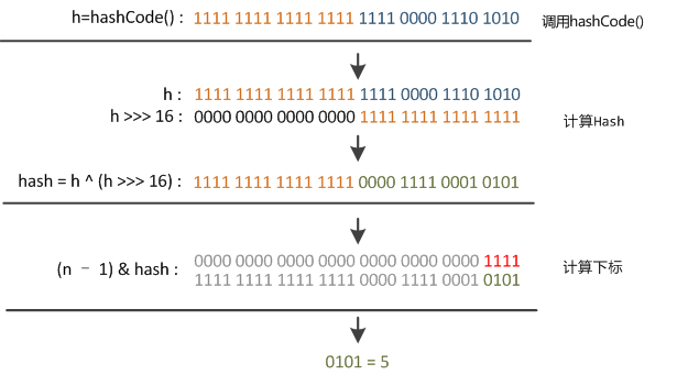 答:由扰动函数源码可知,会有以下步骤:①使用key.hashCode()计算hash值并赋值给变量h;②将h向右移动16位;③将变量h和向右移16位的h做异或运算(二进制位相同为0,不同为1)。此时得到经过扰动函数后的hansh值。图解如下: