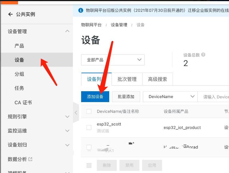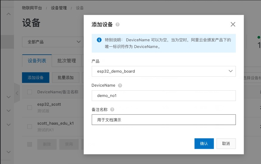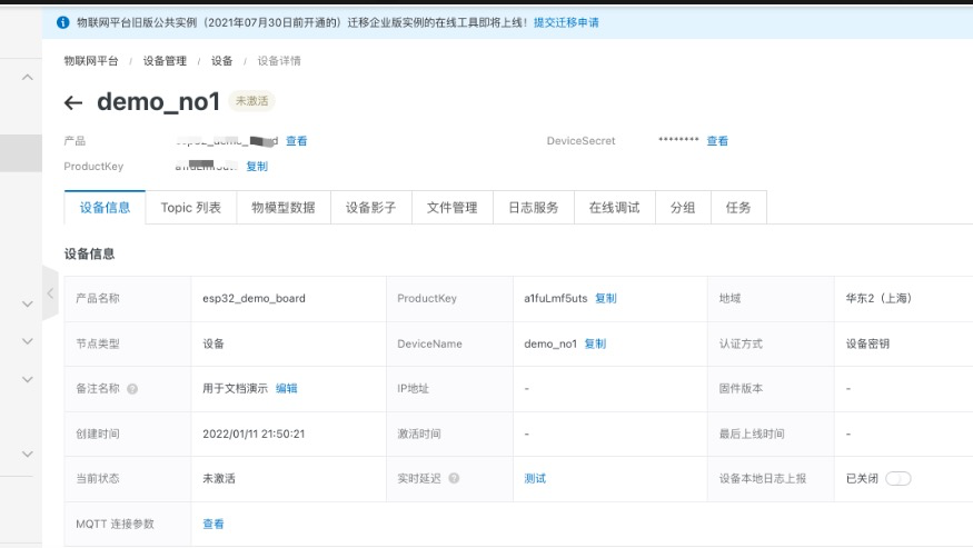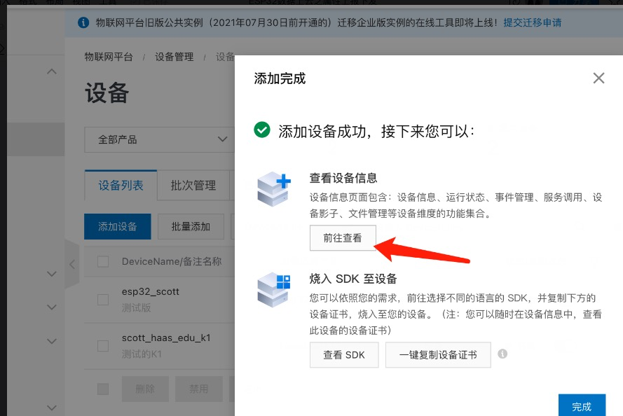 完成产品添加后,需要添加设备(即添加我们目前手里使用的这个开发板)