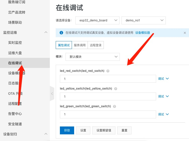 在在线调试当中,可以对之前设定的3个属性进行修改。(0表示关灯,1表示开灯)
